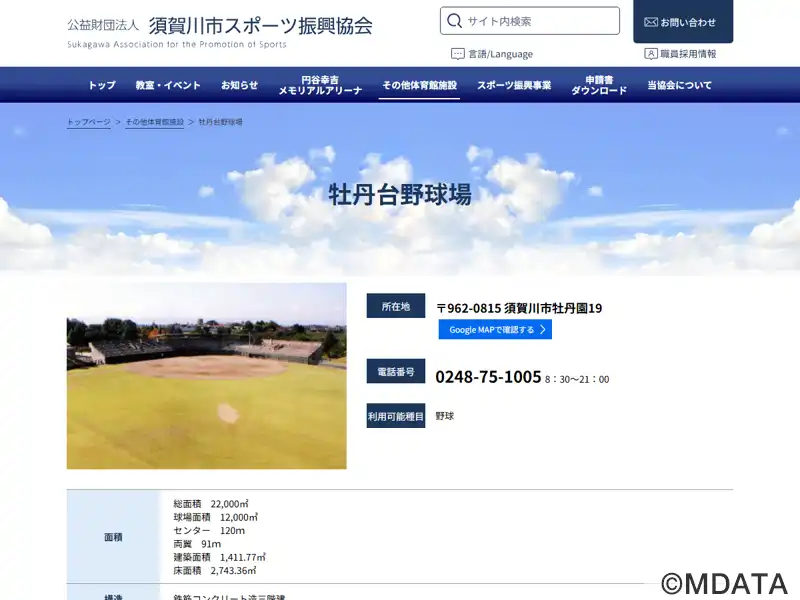 福島県須賀川市の牡丹台運動公園内にある野球場。1971年開場。1983年に2,500席のメインスタンドが設置され、最大8,500人が収容可能となった。両翼91m、センター120mの外野天然芝グラウンドで、地域の学生・アマチュアチームの試合、高校野球や社会人野球、BCリーグ・福島レッドホープスの公式戦も開催される。公園内には体育館やテニスコートがあり、市民の健康と体力増進の場として利用されている。