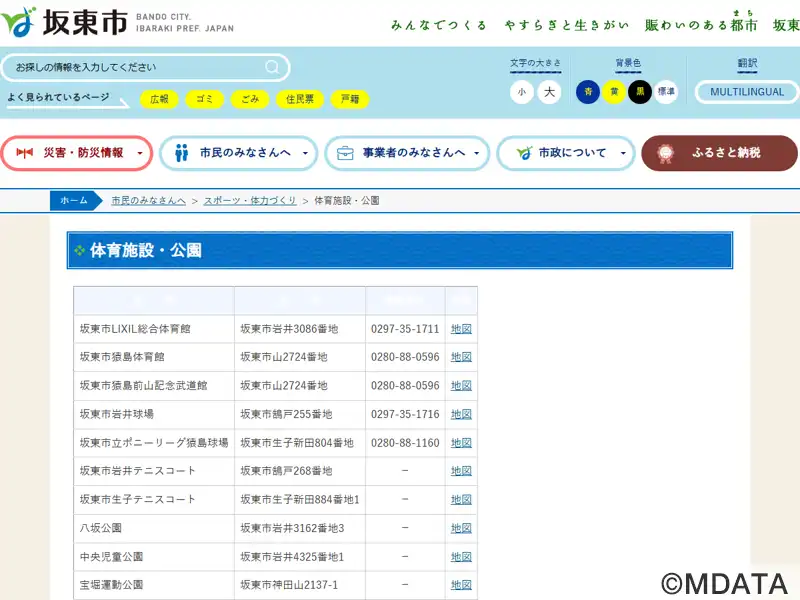 茨城県坂東市の八坂公園内に1983年に開場した市営野球場。両翼94m、中堅118mの外野天然芝グラウンドに、ナイター設備を完備。メインスタンドは一・三塁側に向かって広がる扇形の構造で、バックネット裏には屋根付きエリアもあり、最大7,000人を収容可能。高校野球地区大会や、BCリーグ・茨城アストロプラネッツの公式戦が開催されることもある。周囲には桜の木が植えられ、豊かな自然の中で野球を楽しめる。