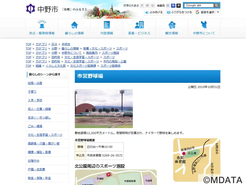 長野県中野市にある野球場。両翼93m、中堅120mの外野天然芝グラウンドで、BCリーグ・信濃グランセローズの公式グラウンドとして、練習や春・秋キャンプ、公式戦が行われる。観客席には木製のベンチシートが設置され、ナイター設備やパネル式のスコアボードを完備。高校野球の地区予選会場として使用され、地域の野球文化を支える施設となっている。また、球場のすぐ裏手を長野電鉄の路線が走るロケーションも特徴。