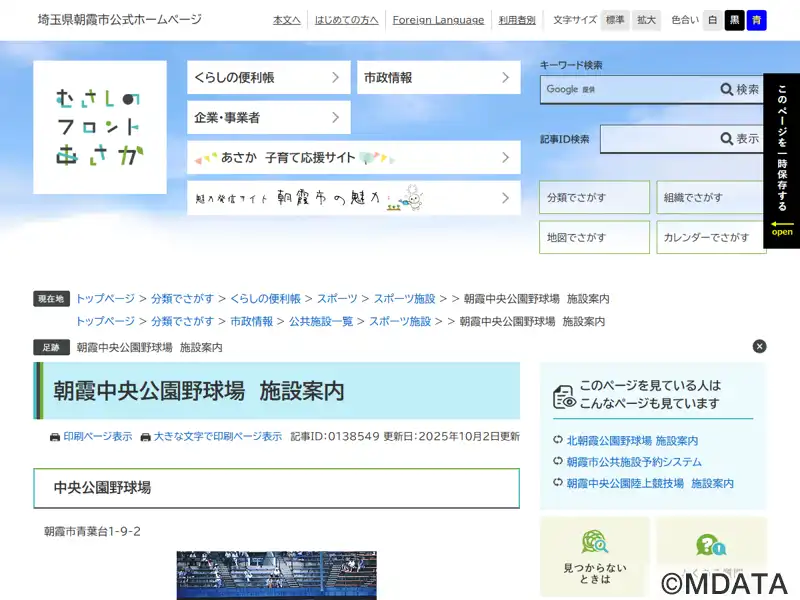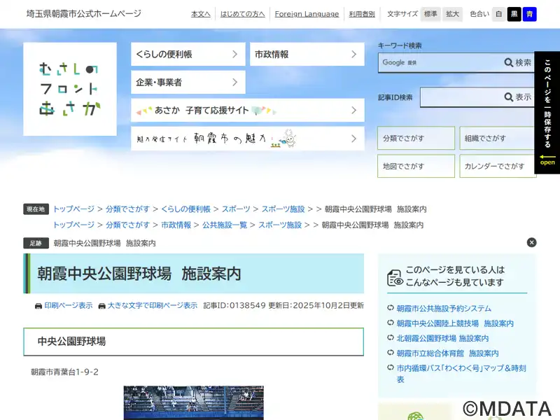 埼玉県朝霞市にある地域スポーツの拠点として1982年に開場した野球場。グラウンドは両翼90m、中堅120mで、内野はクレー舗装、外野は天然芝。観客席は最大6,000人を収容でき、スコアボードには電光掲示板を採用。6基の照明塔も完備する。地域の学生やアマチュアチームによる試合や練習のほか、全国高校野球埼玉大会、イースタン・リーグ公式戦、東都大学準硬式野球リーグ戦、JDリーグ公式戦なども開催される。