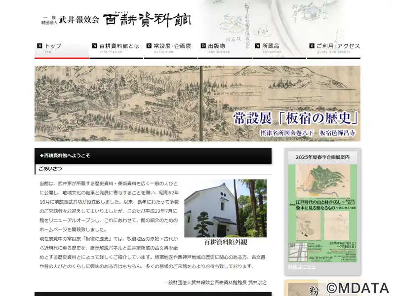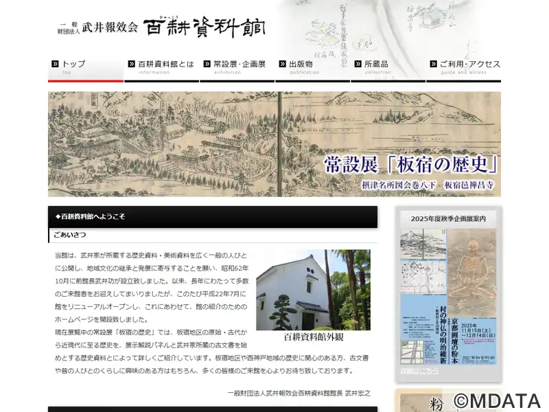 神戸市須磨区板宿地区にある資料館で、旧家・武井家が代々伝えてきた歴史資料・美術資料を保存・研究・公開している。館名は、江戸時代末期から明治期にかけて活躍した武井伊右衛門(百耕)に由来し、地域貢献の精神を受け継いでいる。板宿地区の原始・古代から近現代に至る歴史を紹介する常設展「板宿の歴史」のほか、企画展では江戸時代の京都画壇で活躍した絵師を中心に、武井家所蔵の「粉本」をテーマを設けて紹介している。