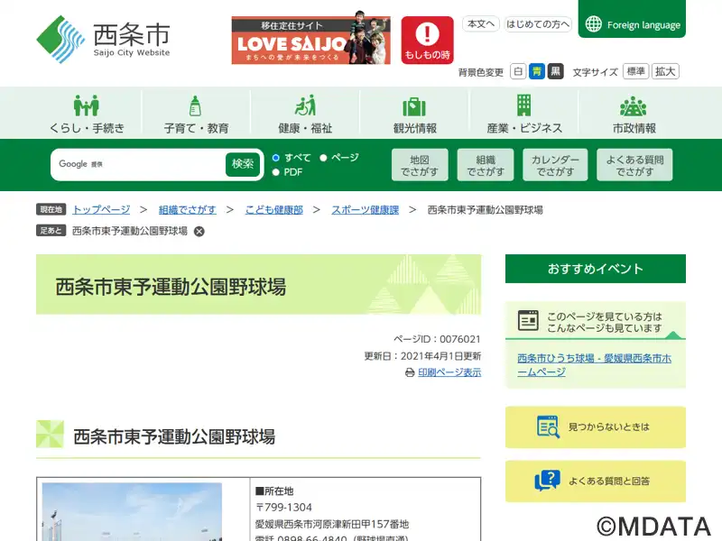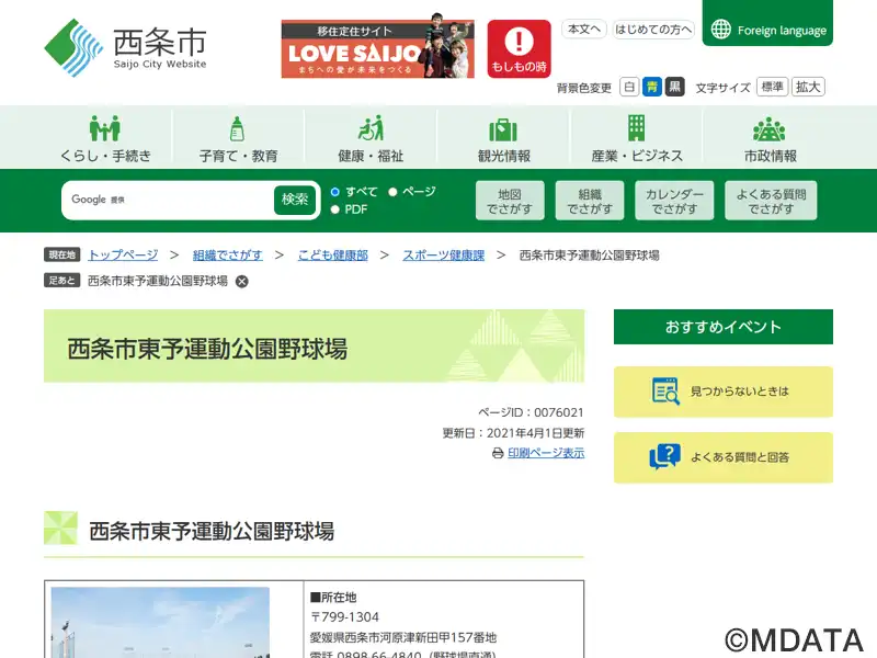 愛媛県西条市の東予運動公園内に1995年開場した野球場。両翼97.6m、中堅122mで、内野は土、外野が天然芝のグラウンドを備え、硬式野球にも対応。6基のナイター照明、LED式スコアボード、雨天時でも投球できるブルペンを完備。観客席は内野スタンドに1,000席、外野芝生エリアを含めると約5,000人を収容可能。地元の学生・アマチュアの試合や練習、四国アイランドリーグplusの公式戦も開催される。