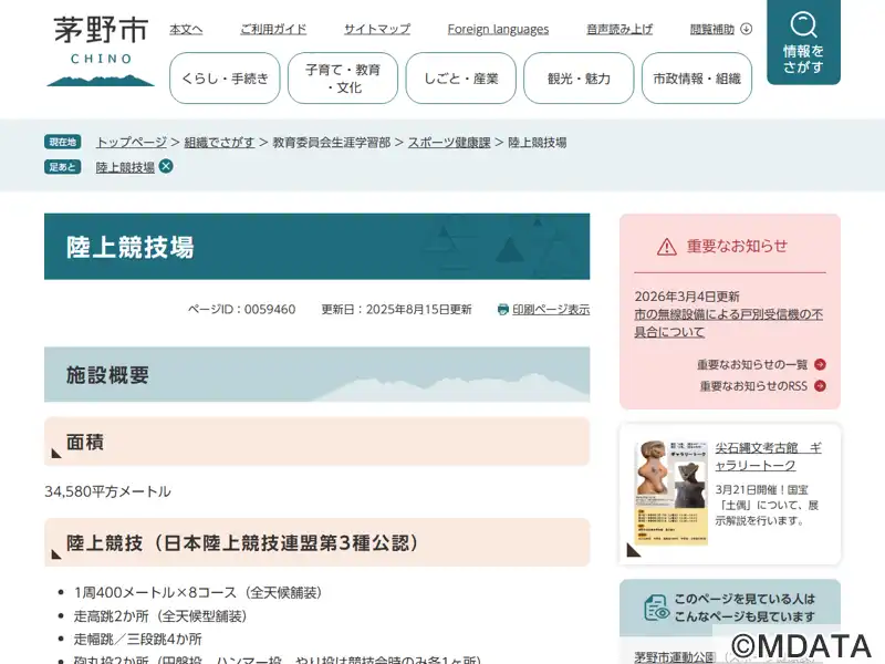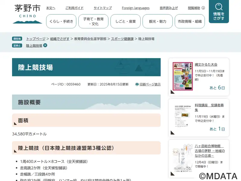 長野県の茅野市運動公園内に1982年開場した陸上競技場。2022年に改修が行われ、全天候型400mトラック×8レーン、100メートル直線レーン、走高跳や走幅跳、砲丸投などの競技エリアを再整備し、日本陸連第3種公認を受けた。メインスタンド1,000人、芝生エリア3,000人が収容可能。インフィールドは天然芝で、地元の学生やアマチュアの練習や記録会のほか、北信越フットボールリーグの公式戦も開催される。