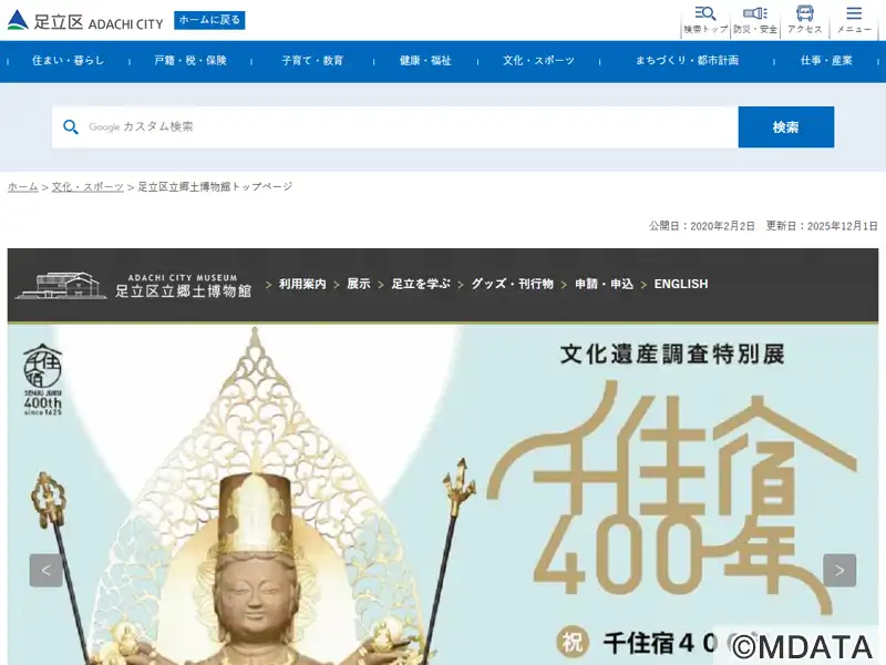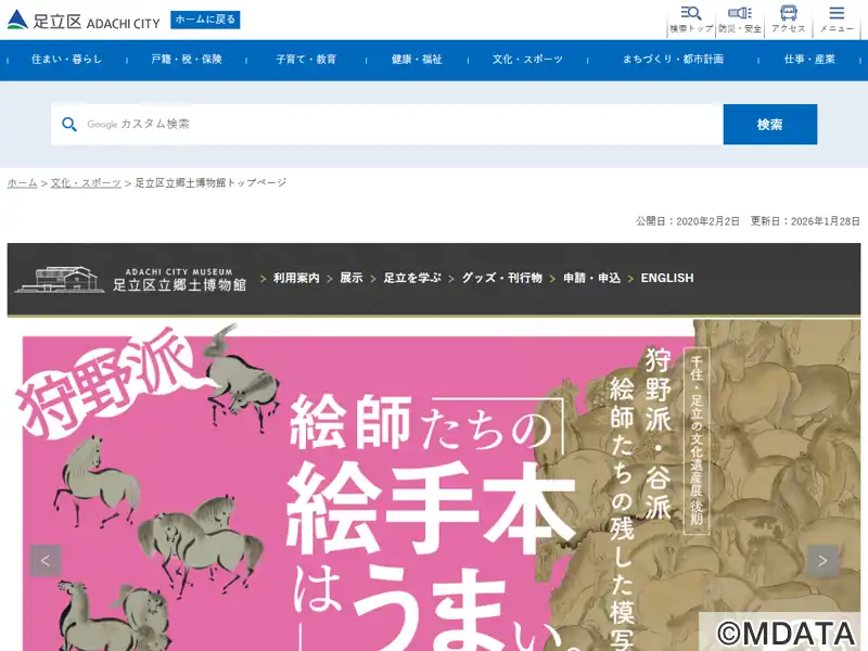 東京・⾜⽴区ゆかりの歴史・民俗・美術資料を収蔵・展示する博物館。1986年に郷土資料館として開設され、2025年4月からは歴史資料と美術品を常設展示する「美術博物館」としてリニューアルした。常設展示は「江戸東京の東郊」をテーマに、近世から近代にかけての生活文化を紹介。屏風や掛け軸などの美術品、1,000点を超える浮世絵版画コレクションも魅力の⼀つ。回遊式日本庭園の「東渕江庭園」と臨渕亭を併設する。