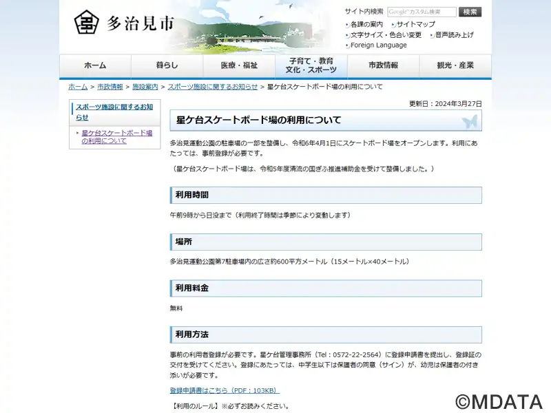 多治見市星ケ台の多治見運動公園内に、2024年4月オープンした公共スケートボード場。コースの両端にはバンクが設置され、中央にはボックスやマニュアルパッドなどの平らな台型セクションが配置されている。路面は白く滑らかなコンクリートで舗装され、約400平方メートルはフラットなエリアで、基礎的な練習や自由な滑走がしやすいレイアウト。子どもから大人まで、初心者も楽しめる仕様となっている。2025年に命名権導入。