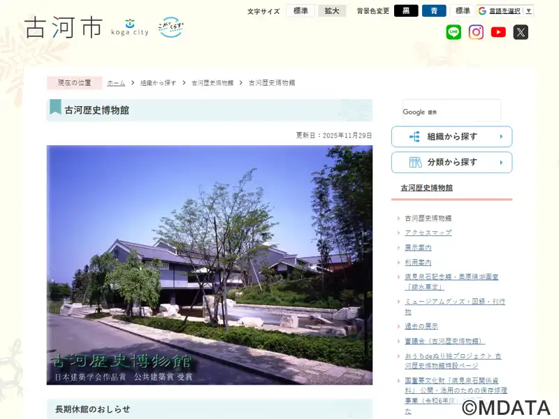 旧古河城の出城跡(諏訪曲輪跡)に1990年に開館した歴史博物館。常設展示は3室からなり、古河藩家老・鷹見泉石が収集した蘭学関係資料(国重要文化財)、原始古代から近代にいたる古河の歴史を紹介する通史展示、さらに幕末から明治期にかけて活躍した奥原晴湖や河鍋暁斎らの書画を展示している。また、向かいには鷹見泉石記念館と奥原晴湖画室が無料公開され、毎年夏には堀を灯りで彩る「夢あんどんと夕涼み」を開催する。