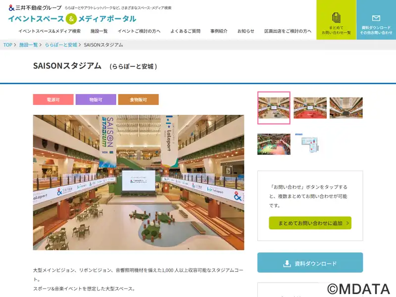 愛知県安城市の商業施設ららぽーと安城内に設けられた、面積730㎡、収容人数1,000人以上のスタジアムコート。1階から4階までの吹き抜け空間に、400インチの大型ビジョンと360度のリボンビジョンを備え、音響・照明設備と連動した映像演出を実現。3人制バスケットボールや音楽ライブ、ダンスなどのイベントに活用できる。イベントのない時は約440席のベンチ・テラス席を設置した休憩スペースとして機能する。