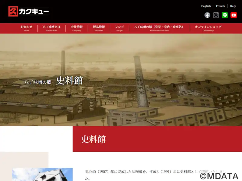 岡崎市八丁町に位置する、1907年に建てられた味噌蔵を活用し、1991年に開館した史料館。矢作川の氾濫に備えて高く積まれた石垣の上に建つ蔵は、かつて味噌の熟成や豆こうじの製造に使われ、現在は国の登録有形文化財に指定されている。館内では等身大の人形による昔ながらの味噌づくりの再現や、宮内省御用達の資料、レトロなパッケージなどを展示し、著名人からの注文の記録や手紙などを紹介。味噌蔵の工場見学もできる。