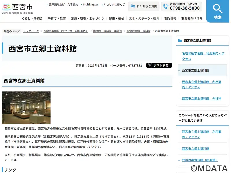 兵庫県西宮地方の考古、歴史、民俗等に関する資料を収蔵・展示する博物館。西宮市教育文化センター内に1985年開館。約4万点の収蔵資料の中から、満池谷層の植物遺体包含層(県指定天然記念物)、具足塚古墳出土品、江戸時代の樽廻船や生瀬宿家並の模型、戦前の観光絵葉書など、約250点を常設展示している。また、分館の名塩和紙学習館では伝統産業「名塩紙」の紙すき体験のほか 名塩紙の紹介や道具類の展示を行っている。