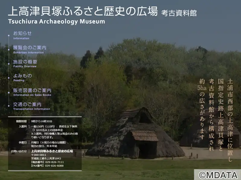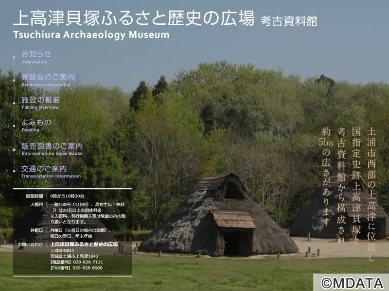 茨城県土浦市に位置する、国指定史跡「上高津貝塚」と考古資料館から構成された歴史体験型の博物館。約5ヘクタールの敷地内には、実物の貝層断面展示施設、復元された竪穴建物や掘立柱建物、縄文時代の森などが配置され、自然と共生した古代人のくらしを体感できる。併設の考古資料館では、上高津貝塚を中心に、市内の遺跡出土品やジオラマ模型、地質標本などの資料が展示され、縄文文化や土浦の歴史を学ぶ講座も開催している。
