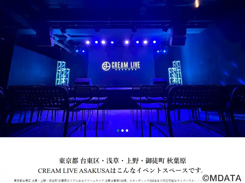 東京台東区・浅草駅近くに、2024年オープンした多目的イベントスペース。スタンディングで最大250人、シーティング最大130席が収容可能。アイドルイベントや音楽ライブ、ファンミーティングのほか、展示会、上映会、トークショー、eスポーツ大会、貸切パーティー、歓送迎会など、さまざまなシーンに対応する。また、ライブ配信や電子チケット販売、デジタルコンテンツの展開までワンストップのサポートを提供する。