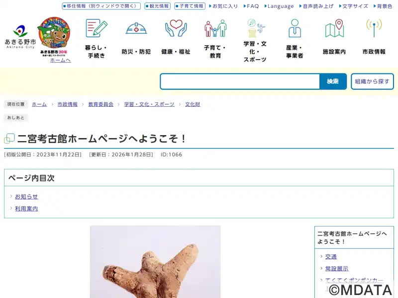 東京都あきる野市の考古資料館。旧石器時代から縄文時代にかけての土器、石器、装飾品など約150点もの考古遺物を展示している。主に二宮神社周辺の遺跡や市内で発掘された出土品で、旧石器時代の細石刃(雨間地区遺跡群出土)や縄文時代の土偶を通じて、原始・古代の暮らしを紹介する。土器や石器にふれられる毎週土曜日の「さわれる土曜日」、勾玉作り・図鑑作成などの体験教室も開催し、考古学を身近に学べる機会を提供する。