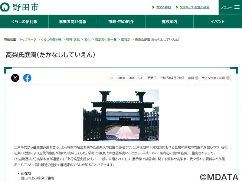 千葉県野田市に位置する、江戸時代から上花輪村の名主を勤め、醤油醸造業で栄えた髙梨家の庭園と邸宅。平成13年に千葉県初の国指定名勝に指定され、近代化産業遺産(醸造業)にも登録されている。展示棟では、醤油醸造に関する資料、高梨家に伝わる貴重な資料や生活用具などを展示している。敷地内には、江戸時代中期建造の門長屋、書院、構堀、明治時代の神楽殿、冠木門、掘割や石垣に近接する茶室「眺春庵」などが点在する。