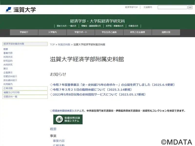 滋賀大学経済学部に設置された博物館。昭和10年設立の近江商人研究室を起源とし、近江商人の研究や近世庶民史料の調査を通じて、経済史、経営史、社会史等の歴史研究に寄与することを目的とする。主な収蔵史料は、近江商人の商業活動を示す古文書を中心に、行政・経済・民具・信仰などに関する民俗資料約1,000点がある。常設展示では近江商人関係史資料と合わせて生活史資料を公開し、研究成果を公表する企画展も開催する。