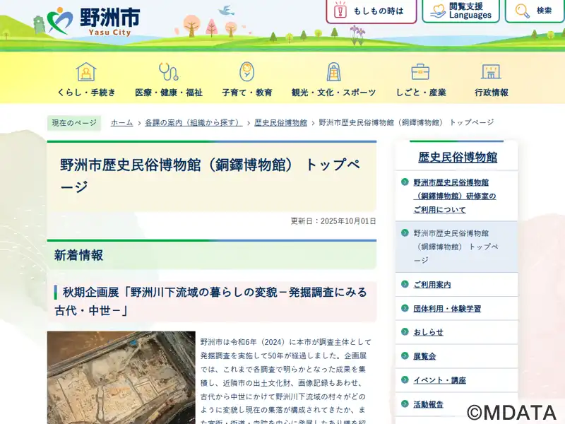 野洲の歴史と民俗、弥生時代の生活文化をテーマにした博物館。1988年に開館し、通称「銅鐸博物館」と呼ばれる。展示は大岩山遺跡から出土した銅鐸に焦点を当て、銅鐸発見のエピソード、形や文様、年代ごとの特色を詳しく解説。また、永原御殿の復元模型や大岩山古墳群の出土品を展示し、地域の歴史や民俗資料を紹介している。隣接する弥生の森歴史公園では竪穴住居、高床倉庫が復元され、工房でまが玉作りなども体験できる。