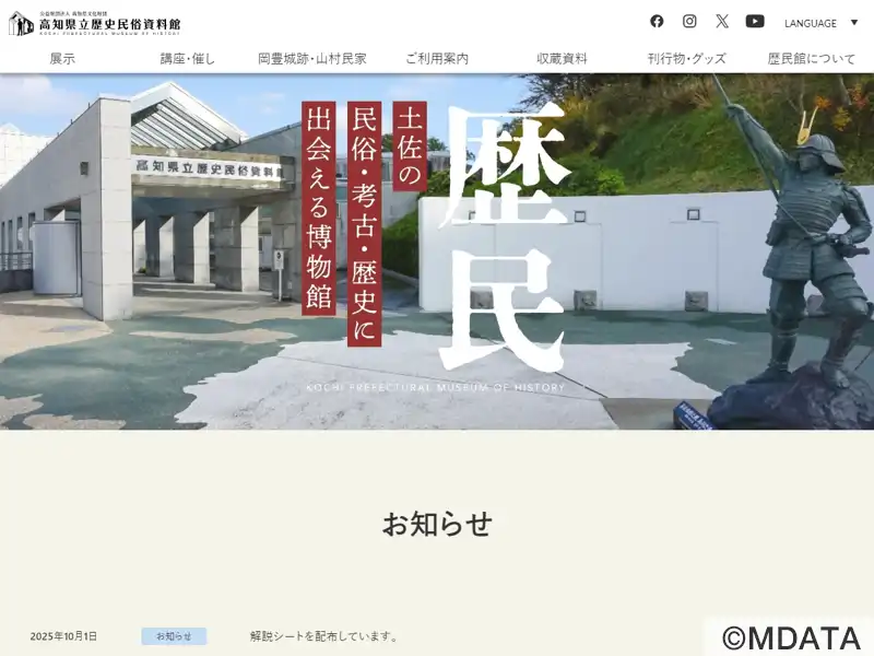 長宗我部氏の居城であった国史跡・岡豊城跡に位置する歴史系総合博物館。1991年に設置され、原始・古代から現代に至る土佐の歴史と文化を、考古・歴史・民俗・美術工芸の資料により総合的に紹介。また、長宗我部展示室では長宗我部元親や国史跡・岡豊城跡に関する資料を展示し、本陣再現コーナーでは戦国時代の雰囲気を体感できる。企画展や関連イベントも開催され、登録有形文化財の山村民家、岡豊城跡の散策と共に楽しめる。