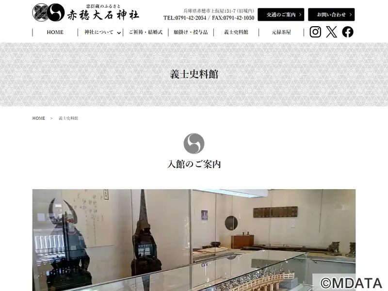 兵庫県の赤穂大名神社内にある、忠臣蔵と赤穂義士の歴史を伝える史料館。義士宝物殿では、大石内蔵助の遺品や討入り関連資料を中心に、備前長船の刀や采配、呼子鳥笛、血染めの軽袗、吉良邸絵図などの史料を公開。別館には浅野家・大石家の宝物、森家伝来の甲冑、和時計などを展示している。義士木像奉安殿は、昭和28年の義士自刃250年記念に建てられ、49体の木像を奉安している。遺構の大石邸長屋門・庭園も見学できる。