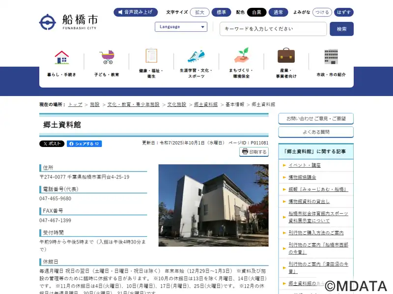 千葉県船橋市の考古・民俗・歴史資料を収集・保存、展示する博物館。1972年、薬円台公園の一角に開館し、2018年にリニューアルした。常設展示では旧石器時代から現代までの通史展示と、「船橋と馬」「鉄道網の発達」「都市の発展」と題したテーマ展示があり、土器や文書、民俗資料の加え、映像や模型、クイズを通じて船橋の歴史を楽しみながら学習できる。また、年数回の企画展、地域史講座・文化講演会なども行っている。
