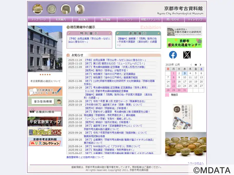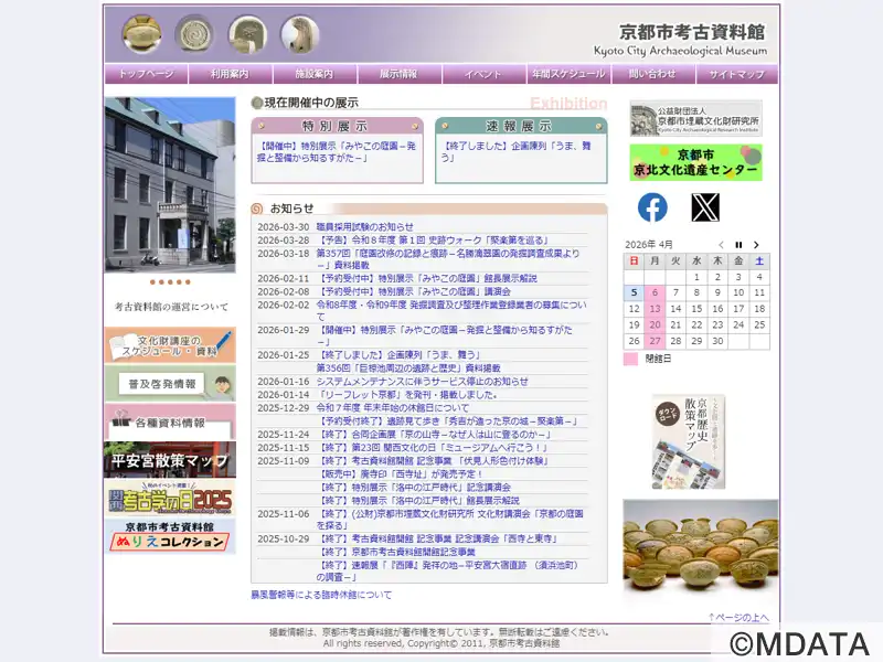 京都市上京区にある1979年開館の考古博物館。市内の発掘調査で出土した先土器時代から江戸時代に至る約1,000点の考古資料を時代ごとに展示。重要文化財の豊楽殿出土品や、縄文時代の住居跡の復元、考古遺物を手にとって観察できるオープン展示もあり、さまざまなテーマの特別展・企画展を開催。建物は1914年築の旧西陣織物館を改修したもので、重厚なレンガ造りの近代建築として市登録有形文化財に登録されている。
