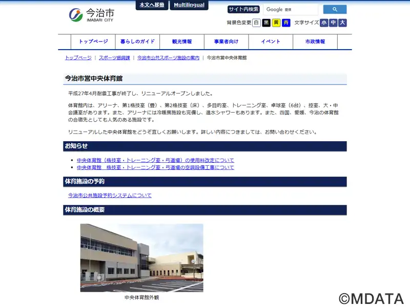 愛媛県今治市の総合体育館。1978年に開館し、2015年に耐震改修を経てリニューアルした。アリーナはバスケットボール2面、バレーボール3面に対応し、フットサルやバドミントン、卓球など幅広い競技に利用できる。2階観覧席、冷暖房設備、放送設備を備え、Bリーグ・愛媛オレンジバイキングスの公式戦も開催される。そのほか、柔道・剣道等が行える格技室、卓球室、多目的室、トレーニング室、会議室が設けられている。