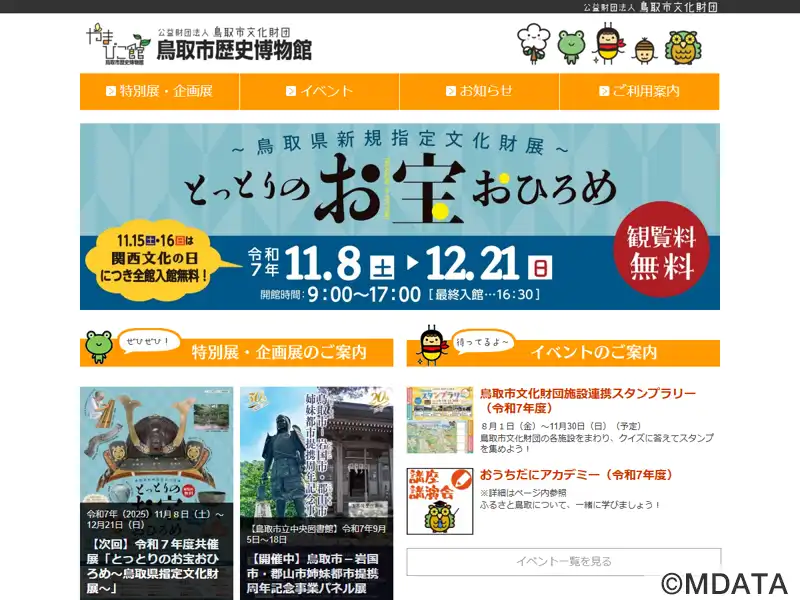 鳥取市に2000年に開館した歴史博物館。鳥取東照宮の参道に位置し、先史から現代までの鳥取の歴史や文化を、実物資料、模型、映像を用いて紹介している。特に中世・天正9年の鳥取城攻め、鳥取藩や藩主池田家、災害と復興など、地域に根差したテーマの常設展示が充実。また、土器パズルや昔のおもちゃを通じて学べる体験コーナーが設けられ、和本や地図作りなどのワークショップや各種イベントも行われる。喫茶コーナーを併設。