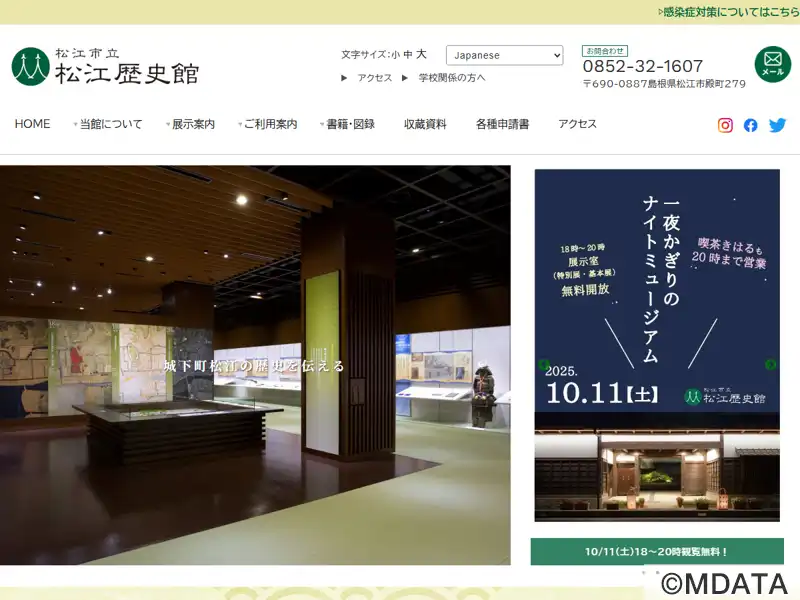 島根県松江市に2017年に開館した歴史博物館。松江城の東に隣接し、武家屋敷を思わせる和風外観や約6万枚のいぶし瓦を用いた屋根が特徴。長屋門をくぐった敷地内は本館、市指定文化財「松江藩家老朝日家長屋」、松江城天守を借景にした日本庭園、伝利休茶室などで構成され、本館内では近世を中心とした城下町松江の歴史や文化にまつわる資料を展示。年数回の企画展・特別展・館蔵品展、講座や歴史体験イベントを開催している。