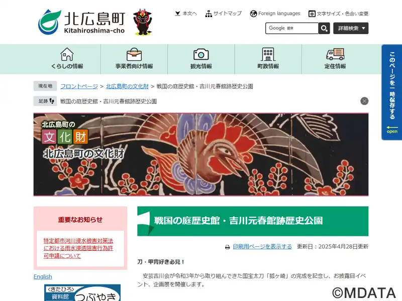 広島県北広島町にある国史跡・吉川元春館跡に隣接する展示施設。2007年に開館し、戦国武将・吉川氏ゆかりの史跡群を紹介。歴史公園として整備した小倉山城、万徳院跡、吉川元春館跡の発掘調査成果や整備内容、出土品を中心に展示している。中世の暮らしや建築・土木技術についてパネルや模型でわかりやすく解説。また、復元台所でのかまど焚きや、近接する万徳院跡歴史公園では復元された中世の蒸し風呂体験を行なっている。