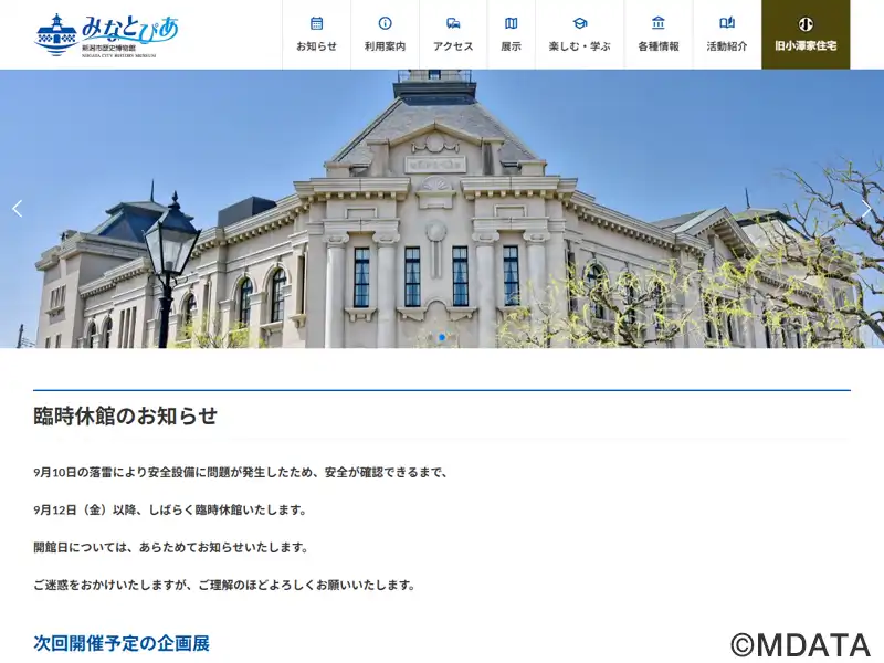 海と川に育まれた新潟の歴史と文化を学べる博物館。2004年に開館した本館では、「郷土の水と人々の歩み」をテーマとした常設展示やミュージアムシアター、体験型展示コーナー、情報ライブラリーがあり、テーマを設けた企画展や講座も開催している。敷地内には、開港当時の姿を残す国重要文化財「旧新潟税関庁舎」、旧第四銀行住吉町支店、堀を模した水路、荷揚げ場や石庫が復元され、港町新潟の歴史的な景観を再現している。