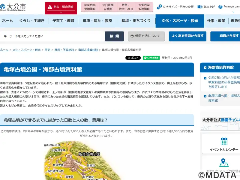 大分市里に位置する、県下最大規模の前方後円墳である亀塚古墳(国指定史跡)に隣接したガイダンス施設。館内は7つのゾーンで構成され、古墳づくりや海部のむらの生活を再現した九州最大規模の大型ジオラマをはじめ、王ノ瀬石棺(県指定有形文化財)の実物資料、副葬品などの出土品、復元模型など150点以上の資料を展示している。さらに、ミニシアターや映像・情報コーナーが設けられ、古墳文化を楽しみながら学習できる。