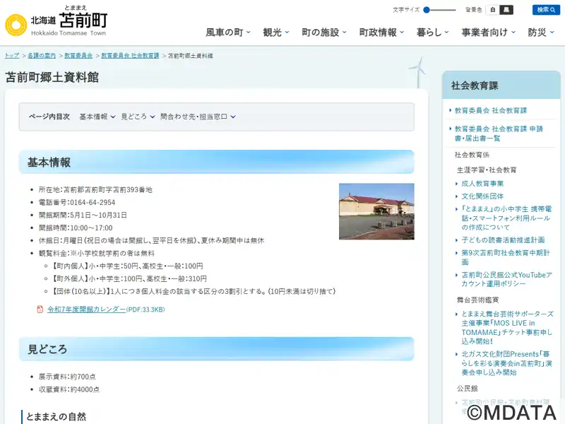 北海道苫前町にある開拓の歴史を伝える資料館。旧役場庁舎を改修保存して1984年に開館した。館内では、農林漁業や生活用具が展示されるほか、巨熊「北海太郎」や「渓谷の次郎」と呼ばれるヒグマの剥製が目を引く。開拓時代に起きた「三毛別ヒグマ事件」について、熊と人間の関わりもくわしく紹介している。また、洋風建築のモダンな雰囲気を残す旧町長室では三毛別ヒグマ事件を題材にしたテレビ映画『羆嵐』が上映されている。