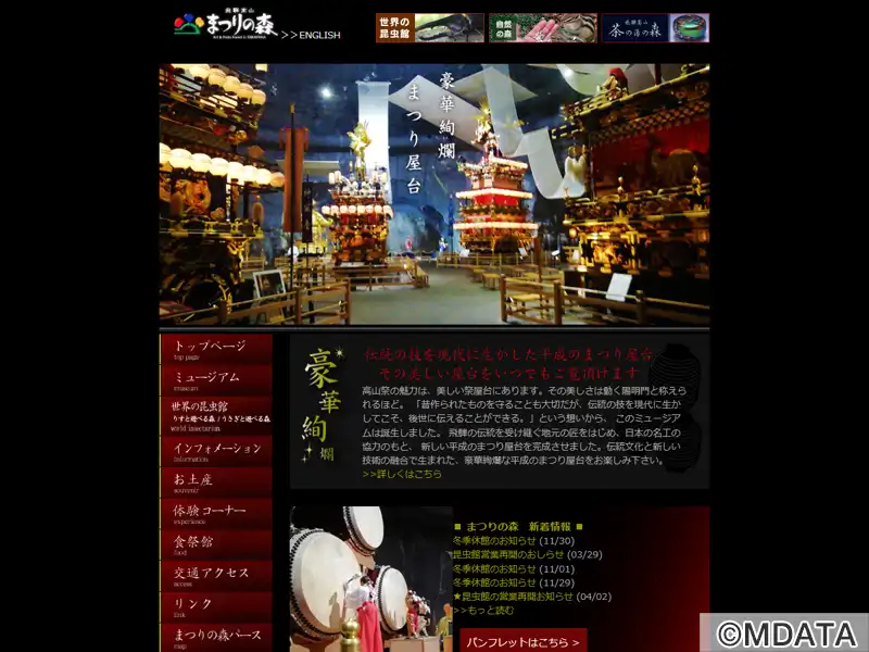岐阜県高山市の観光施設「飛騨高山まつりの森」内にある高山祭の屋台を展示・保存しているミュージアム。江戸時代中期から続く高山祭の伝統を今に伝えるため、山の斜面を掘削して造られた地中ドーム内に、平成期に新たに制作された祭屋台6基を常設展示している。屋台には精巧な彫刻や装飾金具が施され、からくり人形がコンピューター制御で動く演出も見どころ。3万種10万頭にのぼる標本を展示した世界の昆虫館を隣接する。