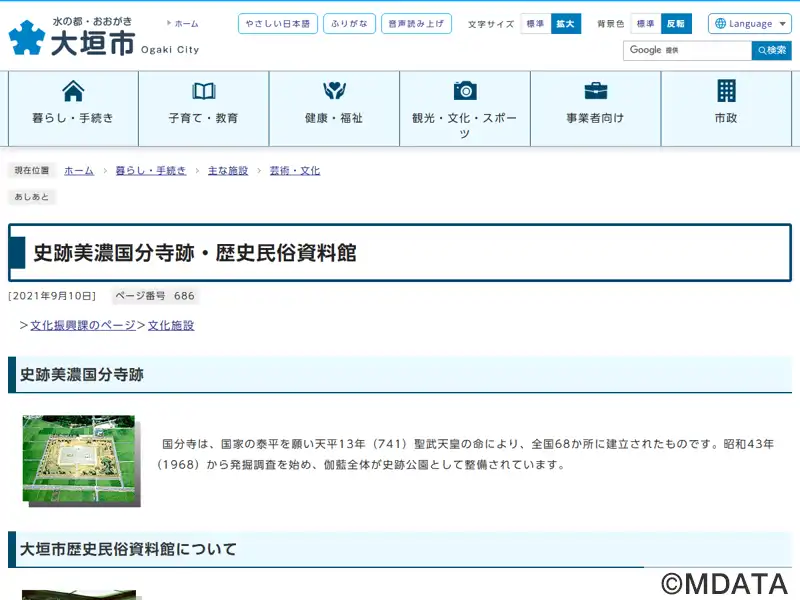 岐阜県大垣市にある国史跡「美濃国分寺跡」に隣接して1978年に開館した地域博物館。考古資料展示室では、寺跡から発掘された貴重な出土品や、発掘により判明した寺跡の全貌を公開するとともに、周辺の古墳からの出土品も展示。東町田遺跡から出土した複数の図柄をもつ絵画土器を間近に見ることができる。また、民俗資料展示室では、西濃地方の農耕文化を中心とした生産用具や生活文化の特色を示す民具などを展示している。