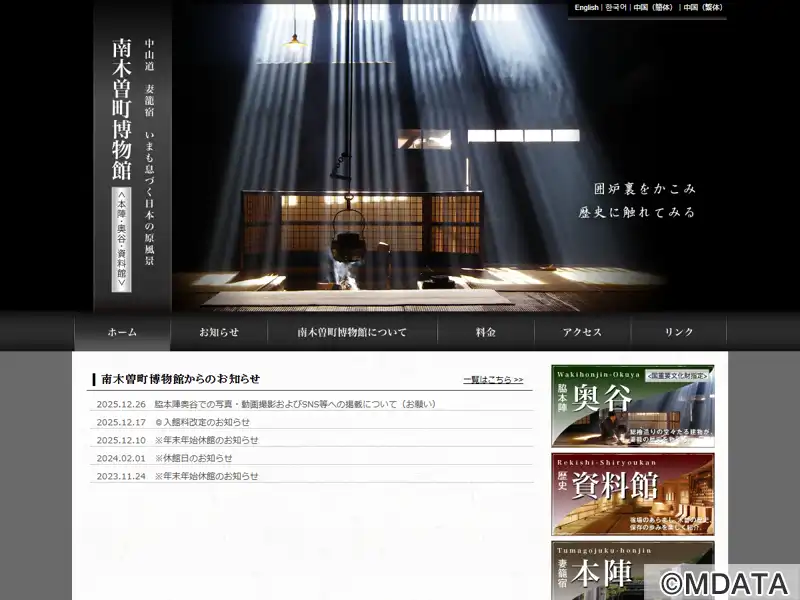 長野県南木曽町にある中山道妻籠宿の歴史を伝える複合博物館。脇本陣奥谷(林家住宅・国重要文化財指定)、江戸後期の間取りをもとに復元された本陣、そして地域史を通観する歴史資料館の三施設で構成される。旧脇本陣は明治初期に再建された総檜造の建物で、裏の土蔵には民俗資料や藤村文学関係資料を収蔵・展示している。隣接する資料館では、古代から近現代に至る木曽の歴史、妻籠宿の成り立ちと町並み保存の歩みを紹介する。