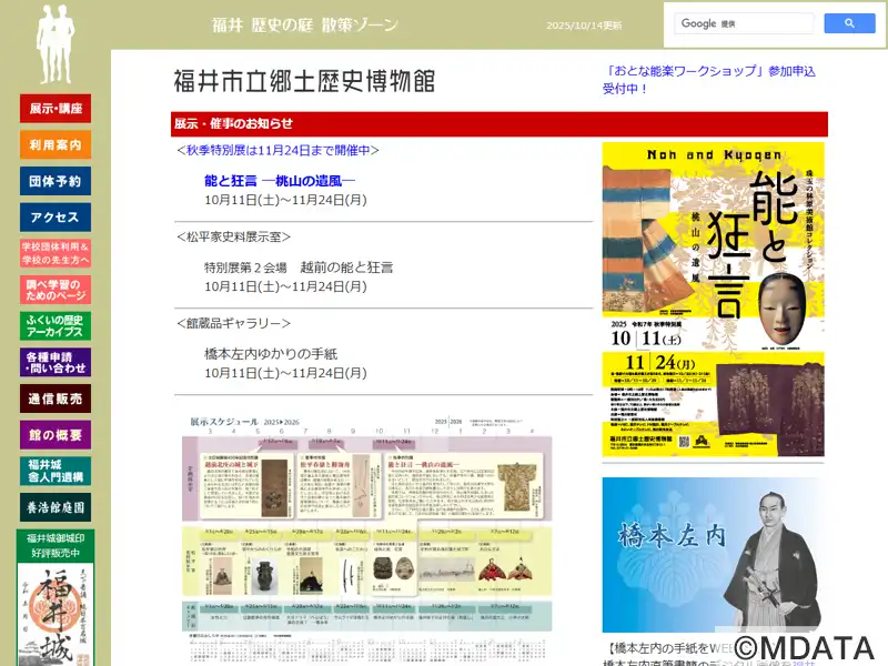 福井市宝永にある越前松平家の別邸だった養浩館庭園に隣接する歴史博物館。1953年足羽山に建設した郷土歴史館を前身とし、2004年に福井城舎人門遺構を擁する現在地に移転開館した。幕末の越前福井藩主・松平春嶽の自筆資料や書状を含む「春嶽公記念文庫」をはじめ、越前松平家や旧福井藩に関する資料が充実。また、古墳出土品、仏教美術など幅広い分野の資料を収蔵し、先史古代から戦後の復興に至る福井の歴史を紹介する。