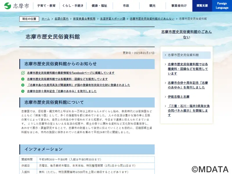 三重県志摩市内の歴史、民俗資料の収集保存と展示を行う資料館。旧郷土資料館を発展的に改組して2012年に開館、磯部生涯学習センター1階に位置する。常設展示では、志摩半島の自然と共生してきた暮らしや風習を、あけぼの・まつり・くらし・生業などのテーマに分けて紹介。中でも、国の登録有形民俗文化財「志摩半島の生産用具及び関連資料」、重要無形民俗文化財「磯部の御神田」「安乗の人形芝居」に関する展示が見どころ。