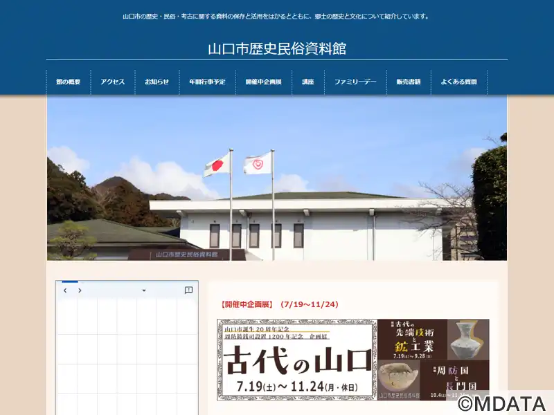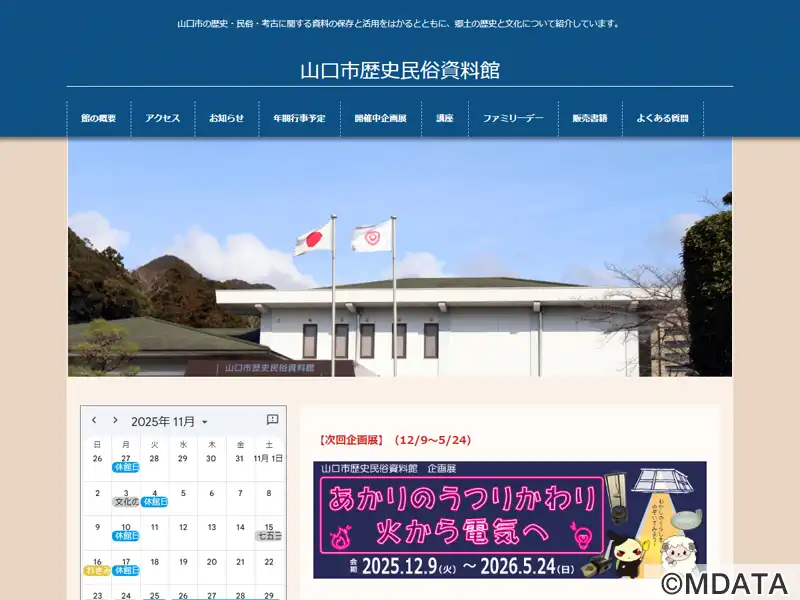 山口市春日町にある郷土の歴史・民俗・考古に関する資料を保存・活用する資料館。市制50周年記念事業として1981年に開館し、平安期の陶窯跡群や周防鋳銭司跡の出土遺物をはじめ、大内氏の治政と大内文化に関する資料、幕末史料などを展示。室町時代に大内義隆が今八幡宮に寄進した鰐口(国指定重要文化財)も寄託展示され、間近に見ることができる。また、年数回の企画展や学芸員による月替わりのコレクション展示も行う。