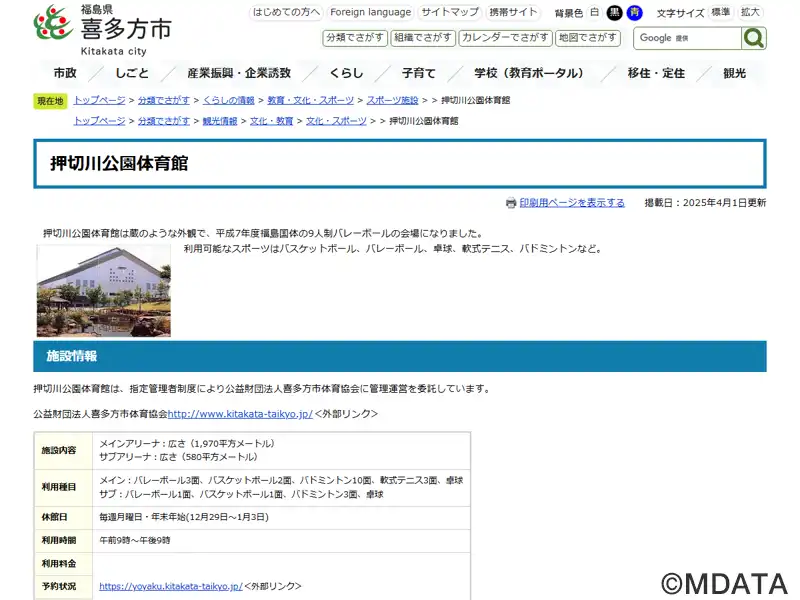 福島県喜多方市の押切川公園内にある屋内スポーツ施設。蔵のまちの景観に調和した外観と東西に設けられた修景池が特徴。メインアリーナはバスケットボール、バレーボール、バドミントン、軟式テニスなど多様な競技に対応し、ステージと放送室、観客席、1周約200mのランニング走路を備える。サブアリーナ、軽運動室、会議室や視聴覚室も設置され、冬季は屋内練習の拠点となり、市のスポーツ活動を年間を通じて支えている。