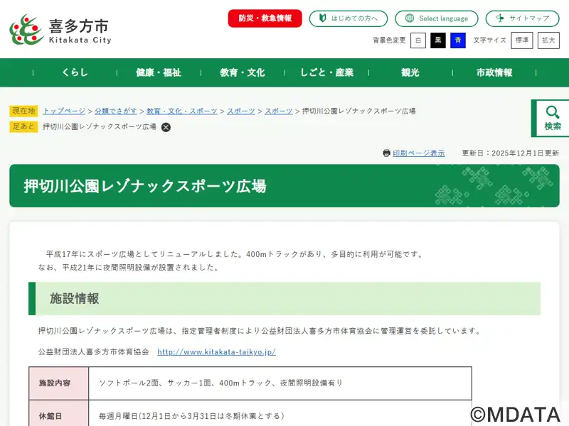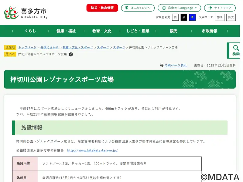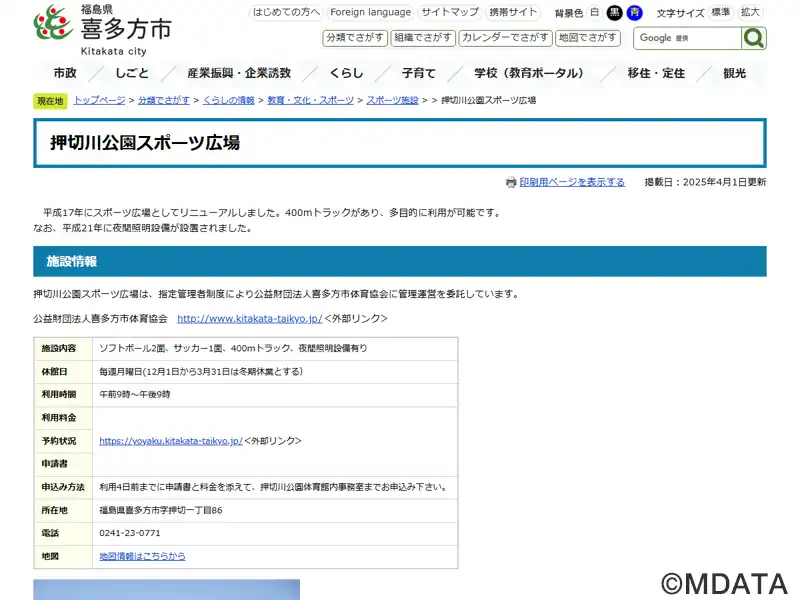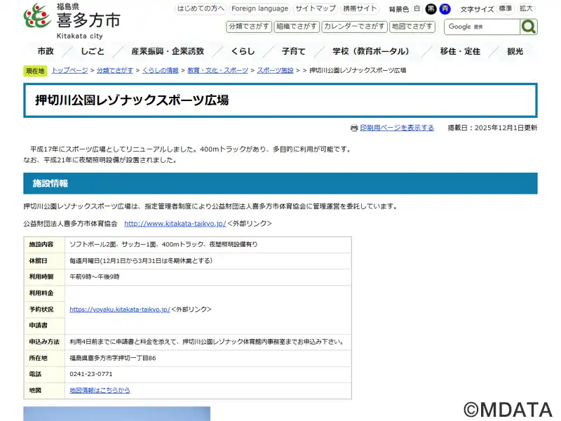 福島県喜多方市の押切川公園内に2005年開場した多目的グラウンド。クレー仕上げの400mトラック6レーンと天然芝のフィールドを備え、サッカー、ソフトボール、陸上競技など多様な競技に対応する。フィールドはソフトボール場としても利用できるよう対面部分を開いた独自の構造を採用し、複数種目の併用を考慮した設計が特徴。観客席はバック側と一部サイドに芝生席が設けられ、2,000人収容可能。夜間照明も完備する。
