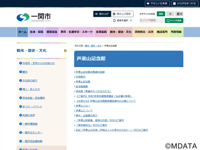 岩手県一関市に2007年開館した、江戸中期の儒学者・芦東山(1696–1776)の生涯と思想を紹介する先人記念館。館内には、東山の生涯や業績を時系列にたどる常設展示室、企画展示室、ガイダンス上映や講演会などを行うホール、研修室、収蔵庫を備える。展示は原本無刑録15冊(複製)をはじめ、実物資料を中心に、学びの時代から晩年までを5つのテーマで構成する。周辺には生家や墓地などゆかりの地が点在している。