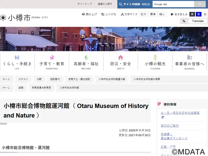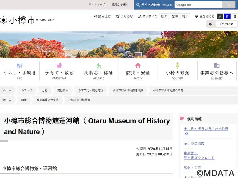 北海道小樽市にある明治26年建築の「旧小樽倉庫」を活用した博物館。木骨石造と呼ばれる独特の様式や、北海道では珍しい屋根のしゃちほこが特徴。館内では小樽市の歴史と自然環境について、約2万点の資料展示で紹介。第一展示室では、アイヌ文化や北前船、ニシン漁業に関する資料を展示し、第二展示室では海と山が接する地形が生んだ多様な生態系に焦点を当て、小樽に生息する動植物の標本など豊富な自然史資料を展示している。