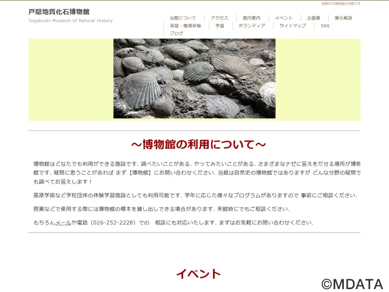 長野市戸隠にある旧小学校校舎を改築した自然史博物館。長野盆地の形成史や里山の自然、県天然記念物のシンシュウゾウ化石などを紹介している。戸隠一帯が海だったことを示す貝やクジラ、ダイカイギュウなどの化石をはじめ、岩石や鉱物標本、水生生物の飼育展示、ハンズオン展示も多数あり、学校らしさを残したユニークな展示が特徴。化石のクリーニング体験や自然観察などのイベントも行われ、体験学習の場として活用されている。