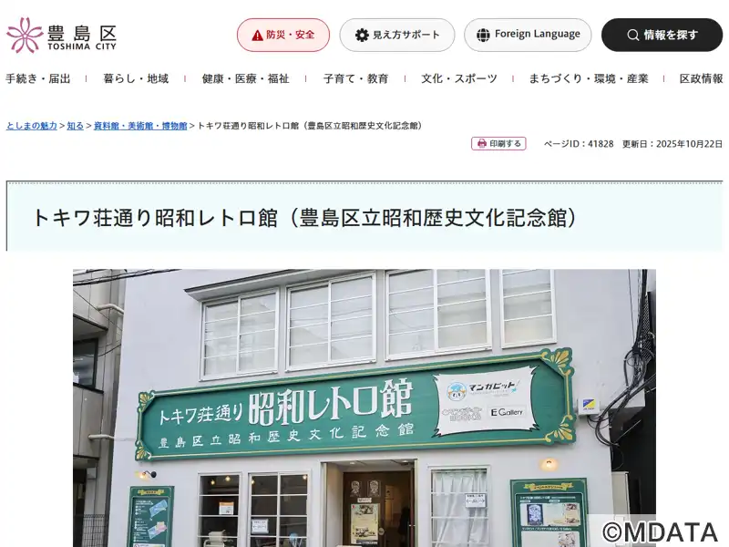 東京豊島区にある、昭和の歴史・文化を継承する記念館。戦後復興期の建造物である昭和20年代に建てられた戦後マーケット「味楽百貨店」を改修して2022年に開館した。昭和10~20年代の日常を描いた原画に加え、白黒テレビなど家電が普及した昭和40年頃の生活空間を再現。また、高度経済成長期の池袋駅周辺、人世横丁、神田川周辺の風景を精巧に表現したジオラマも展示され、変化していく街並みと人々の暮らしをたどる。