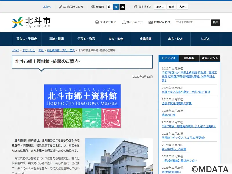 北海道北斗市地域の歴史・文化を紹介する資料館。南北文化の結節点を示す先史時代の土器や石器、中世城郭の資料やジオラマ、箱館戦争の遺物などを通じ、和人渡来から幕末・明治期の激動の歴史を解説する。また、地域の基幹産業である農業・漁業・セメント製造に関する資料や、大正・昭和期の生活用具を展示し、人々の営みと産業の発展を伝えている。このほか、市内文化財やゆかりの人物について展示し、歴史講座も開催している。