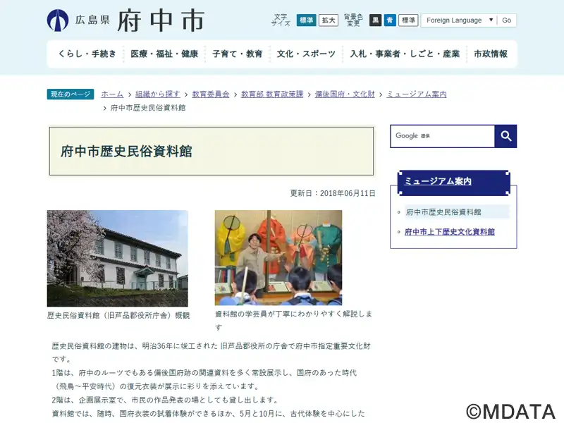 広島県府中市にある、明治36年竣工の旧芦品郡役所庁舎を活用した資料館。市指定重要文化財の建物では、漆喰壁と水色の窓枠、庇しや軒の飾りなど擬洋風校舎ならではの意匠が見られる。第1展示室では縄文〜古墳時代、第2展示室では備後国府跡を中心にした奈良・平安時代の出土遺物を展示し、原始・古代の地域史を解説する。企画展示室は市民作品の発表の場にも利用され、国府衣装の試着体験や古代体験イベントも開催している。