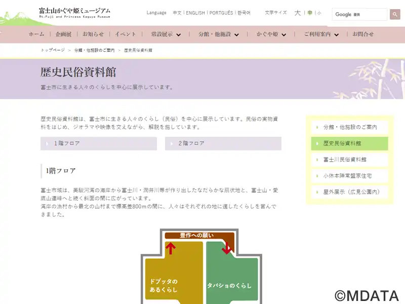 1994年に開館した富士市域の民俗資料を展示する資料館。1階では、標高差のある地形と多様な生活様式に注目し、湾岸の漁村(ハマ)、浮島ヶ原の湿田(ドブッタ)、加島平野の水田地帯(タバショ)、山麓の畑作や林業(ヤマガ)、行き来する人々など各コーナーに分けて実物の道具やジオラマなどを展示。2階では富士山南麓の製紙業の歴史、こどもの学びと遊び、戦争関連資料を展示し、「紙のまち富士」の近代史を紹介している。