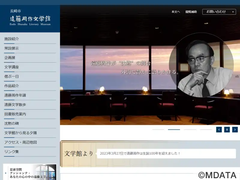 長崎市外海地区にある文学館。角力灘を望む高台に建ち、小説『沈黙』の舞台となった外海の美しい風景とともに、遠藤周作の生涯と文学世界を伝える。展示室では誕生から晩年までの歩みを年表で紹介し、書籍や原稿、取材ノート、各種資料を通して創作の過程をたどる。2000年の開館以来、2年ごとにテーマを変えて企画展を行い、文学講座や上映会も開催している。館内には、空と海と自分に“出会う”思索空間が設けられている。
