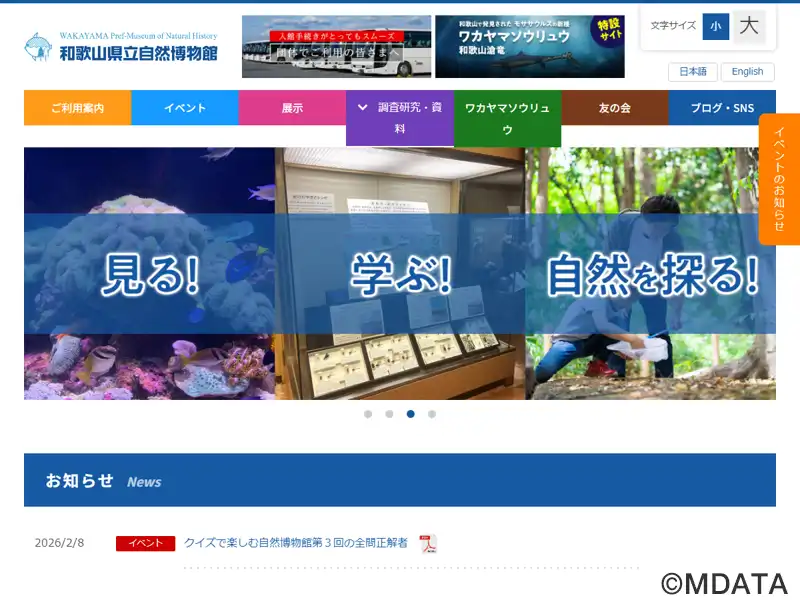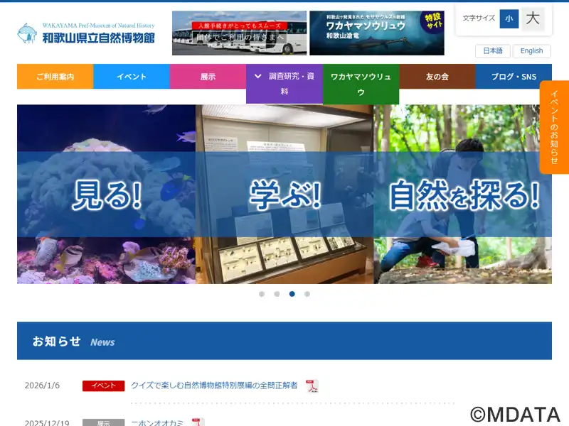 和歌山県海南市の沿岸部に位置する自然史系博物館。和歌山県内の自然を調査・研究し、和歌山の自然と生きものを楽しく学ぶ施設として1982年に開館した。和歌山県指定天然記念物オオダイガハラサンショウウオを常設展示している。県内に生息する淡水魚や海水魚など約450種3,000点の水の生きものを水槽で生体展示するほか、動植物、昆虫、貝、化石・鉱物などの標本や、「那智原始林」を再現したジオラマも見どころ。
