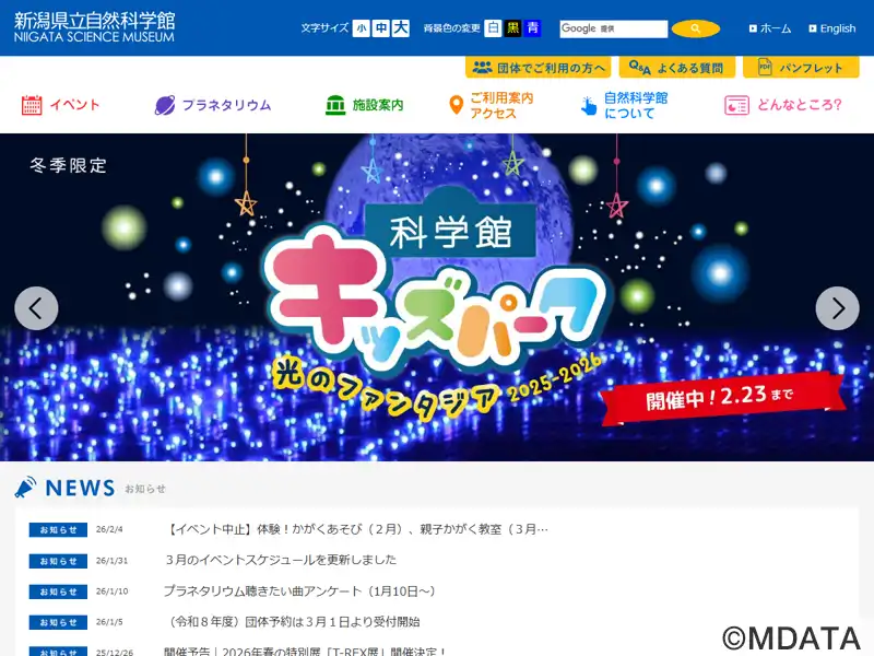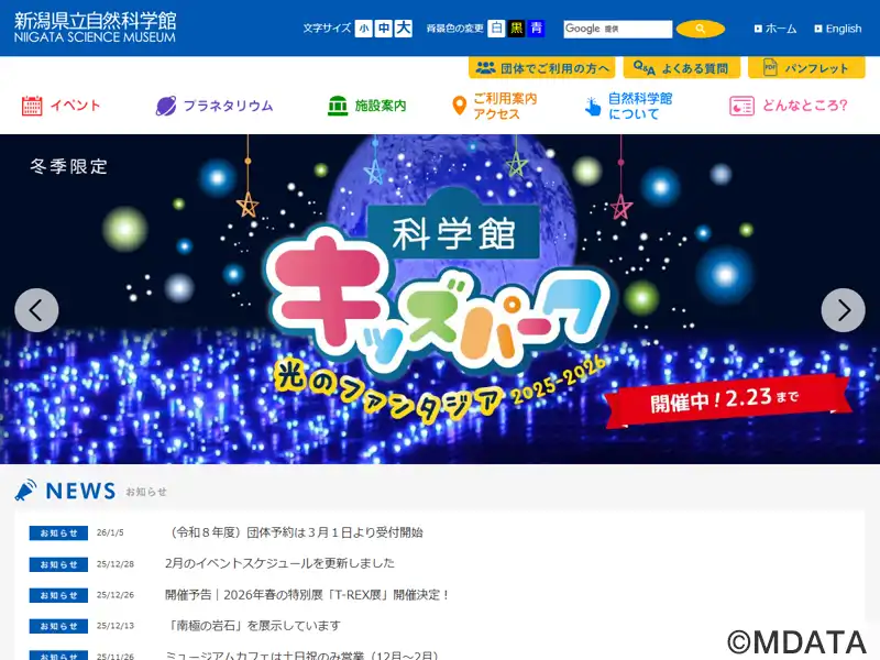 新潟県の鳥屋野潟公園女池地区にある総合科学館。立県100周年を記念して1981年に開館した。展示場は「自然の科学」「生活の科学」「不思議な広場」「新潟県の移り変わり」の4つのエリアで構成され、参加体験型の展示や実演プログラムが豊富で、楽しみながら自然や生命、科学について学べる。さらに、直径18メートルのプラネタリウムや天体観測室、展望台、屋外展示場には蒸気機関車やヘリコプターなども設置されている。