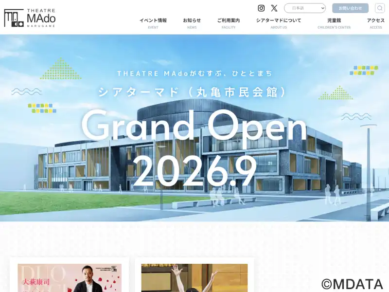 香川県丸亀市における文化芸術活動の新たな拠点として2026年9月開館予定の複合文化施設。旧市民会館の老朽化に伴いリニューアルする。メインの大ホールは、可動式プロセニアムやオーケストラピット、音響反射板などを備え、音楽、演劇など多様な舞台芸術に対応可能。そのほか、可変式舞台をもつ小ホール、防音構造のスタジオ、展示機能を充実させたマルチスペース、ミーティングルーム、キッチン施設や和室が設置されている。
