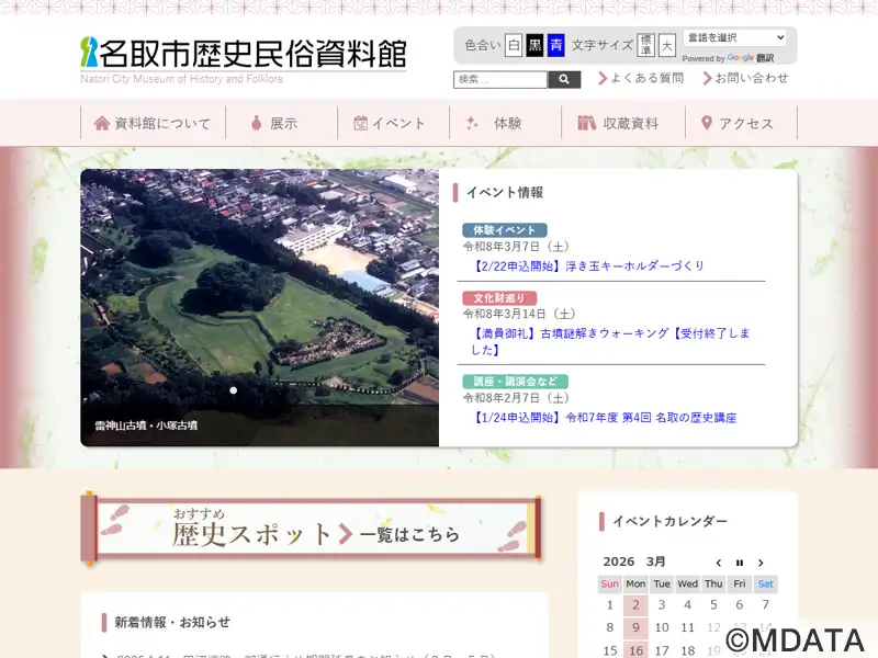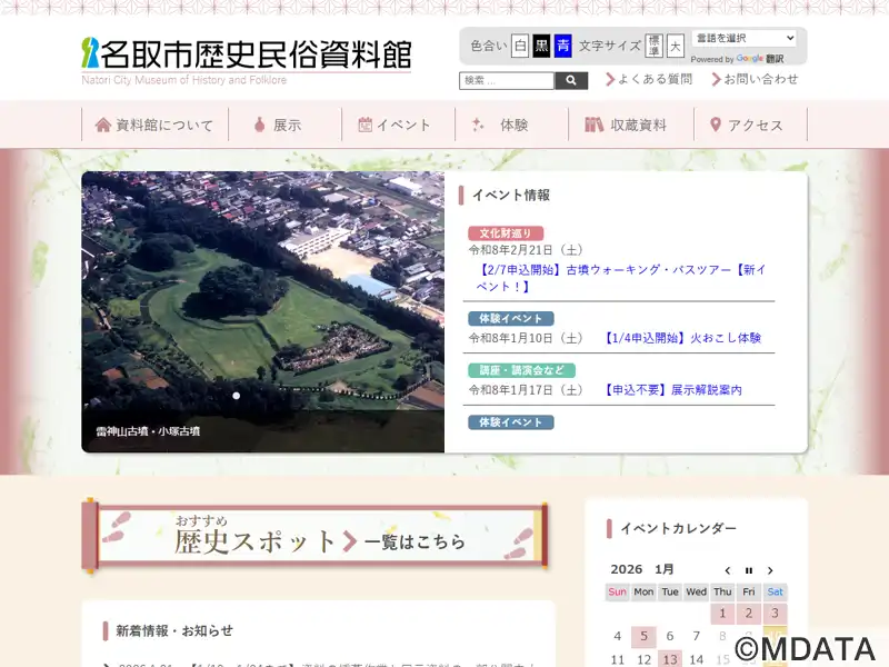 名取市の歴史文化を伝える資料館。震災後の支援で建設された建物や土地を転用して2020年に開館、敷地内に2つの展示室と体験学習室、広場が整備されている。発掘調査の出土品や民具など約1万2千点に及ぶ資料を収蔵。「考古の展示室」では雷神山古墳をはじめ、旧石器時代から平安時代までの考古資料を中心に紹介。「歴史・民俗の展示室」では名取熊野三社や、奥州街道の増田宿、江戸時代以降のくらしに焦点を当てて展示する。